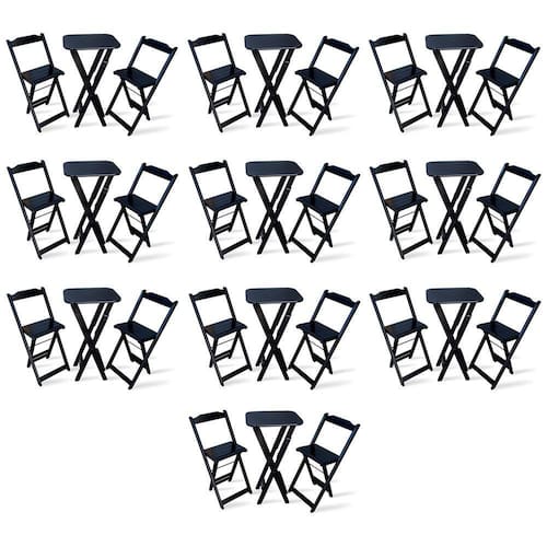 Kit De 10 Conjuntos Dobrável Bistrô Preto De Mesa Com 2 Cadeiras - Tarimatãé ideal para bares, restaurantes, estabelecimentos, áreas de lazer e tambem para sua casa. Em madeira maciça, tornando-os resistentes e duráveis. Seu design permite que esse conjunto seja encaixado em qualquer ambiente, trazendo um toque a mais para seu estabelecimento. Além de sua durabilidade, o que lhe trará conforto para servir seus clientes. Por ser dobrável torna-se mais fácil guardar, manusear e limpar o produto.Atenção: EVITE USAR PRODUTOS ABRASIVOS E QUÍMICOS PARA LIMPEZA DO PRODUTO, aconselha-se o uso de pano umedecido para melhor conservação mantenha o produto fora de chuva e sol constantes.*imagens meramente ilustrativas*çMedidas Mesa Bistrô:Tampo 54cm x 45cmAltura 98cmçDimensões Cadeira Bistrô:Altura da cadeira aberta 95cmAltura da cadeira fechada 105cmAltura até o assento 61cmLargura 41,5cmLargura vão do assento 37,5cmProfundidade 43cmProfundidade do assento 32cm