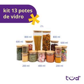 "Oii! Tüd bem? Vem saber mais sobre o kit de 13 potes de vidro com tampa de bambu herméticos redondo de 200ml, 400ml, 600ml, 800ml e 2L da Tüd!