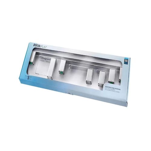 O kit de acessórios para banheiro da linha Docol Flat oferece maior conforto para quem busca comprar produtos para todo o banheiro. Com um design simples e elegante, as peças apresentam o equilíbrio perfeito entre tamanho, forma e acabamento. Por isso, integram-se perfeitamente ao seu banheiro ou sala de banho. Os produtos inclusos, como porta-toalha, saboneteira, papeleira e cabides, possuem sua versão em niquel, ouro, grafite e cobre e sem parafusos aparentes, o que facilita a higienização e mantém o design mais sofisticado e simples. Vale lembrar que os acabamentos são vendido em lojas especializadas.