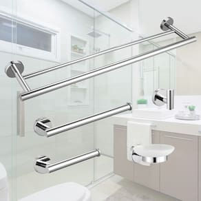 COMPOSIÇÃO DO KIT: 01 - Toalheiro Duplo: Comprimento 60 cm / Largura 12cm 02 - Toalheiro: Comprimento 28,5 cm / Largura 8cm 03 - Papeleiro “Porta Papel”: Comprimento 16 cm / Largura 8cm 04 - Saboneteira: Comprimento 12 cm / Diametro 10cm 05 - Cabide “Gancho”: Comprimento 6 cm / Largura 4cm Obs: Parafusos, buchas de fixação e chave Allen acompanham o kit.