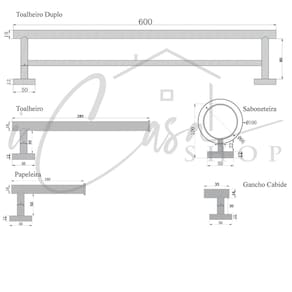 COMPOSIÇÃO DO KIT: 01 - Toalheiro Duplo: Comprimento 60 cm / Largura 12cm 02 - Toalheiro: Comprimento 28,5 cm / Largura 8cm 03 - Papeleiro “Porta Papel”: Comprimento 16 cm / Largura 8cm 04 - Saboneteira: Comprimento 12 cm / Diametro 10cm 05 - Cabide “Gancho”: Comprimento 6 cm / Largura 4cm