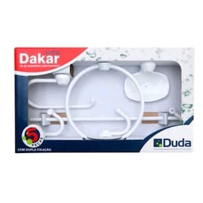 Kit para banheiro diferenciado e elegante. Possui dupla fixação. Papeleira e saboneteira.Acabamento em branco Composição Basica do Kit:01 Saboneteira de Parede01 Papeleira com Proteção 01 Porta-Toalha de Banho01 Porta-Toalha de Rosto 01 Cabide