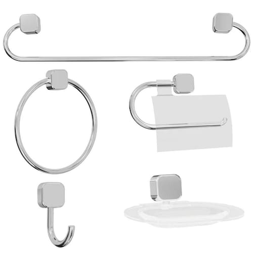 - 1x Cabide Simples1x Saboneteira1x Papeleira com Tampa1x Porta Toalha Argola1x Porta Toalha Bastão