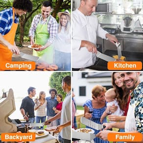 ?Ferramentas para grelhar Chef's Choice?Nosso conjunto de ferramentas para grelhar com raspador de chapa, espátulas e garrafas de óleo são ferramentas de grelha necessárias para o chef de grelha. Ótimo para virar hambúrgueres, panquecas, vegetais, cortar pão, carne e salsicha, raspador e picador para cortar alimentos em cubos e raspar as grelhas. A espátula Long Griddle pode mover grandes quantidades de comida com rapidez e precisão. Isso agradará a todos em seu churrasco, festa de fim de semana ou suas refeições diárias.