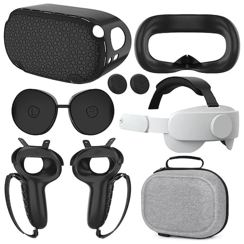 Alça de cabeça com design de equilíbrio de gravidade, estojo resistente à água e à prova de choque, capas de silicone para controladores e proteção facial.Características