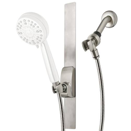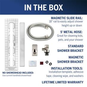 Transforme facilmente seu chuveiro de mão atual em uma experiência de banho personalizada com o kit de acessórios de fita deslizante magnética de níquel escovado Waterpik (CABEÇA DE CHUVEIRO NÃO INCLUÍDA). Este kit de acessórios de fita deslizante magnética é montado em qualquer lugar do chuveiro e oferece 18 polegadas de ajuste de altura. Ótimo para residências com alturas variadas ou quando os tubos do chuveiro estão muito altos ou muito baixos. Solução fácil para tomar banho sentado ou quando os chuveiros estão pendurados sob o cano do chuveiro. Basta levantar o suporte magnético e deslizar o chuveiro de mão para cima ou para baixo na tira de aço inoxidável para ajustá-lo à altura preferida do chuveiro. A mangueira de metal de 5 pés oferece maior comodidade ao dar banho em crianças ou animais de estimação e limpar o chuveiro. Compatível com a maioria dos chuveiros portáteis padrão, este kit de acessórios universais adere facilmente à maioria das superfícies de chuveiro. É necessário seguir as etapas de instalação no manual de instruções para que o kit seja guardado. Não são necessários parafusos ou furos!