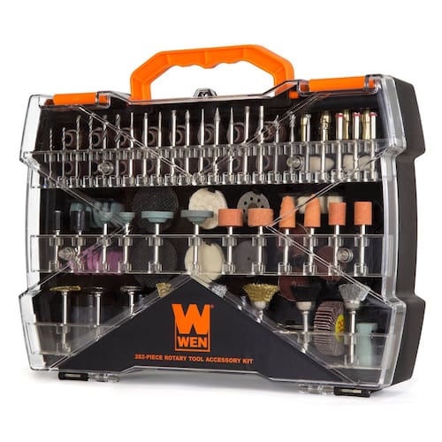Kit de acessórios para ferramentas rotativas WEN 230282A de 282 peças com estojo de transporte - Possui 282 acessórios para lixar, esculpir, rebarbar, cortar, perfurar, lixar, polir, gravar e muitos outros verbos - Pincéis com cerdas de arame funcionam muito bem para remover ferrugem, decapar tinta, esculpir abóbora e muito mais - Discos e brocas de moagem perfeitos para afiar facas ou aparar facas unhas para cães — Inclui brocas de metal revestidas com diamante, cortadores HSS, discos de lixar, discos de corte, faixas de lixar de fuso, rodas de polir, brocas, pasta de polimento e muito mais - Compatível com as ferramentas rotativas WEN, bem como com qualquer outra ferramenta rotativa que aceite brocas com hastes de 1/8 de polegada