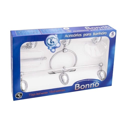 O Kit Bonno 5 peças é composto por: 1 cabide, 1 porta toalha de rosto, 1 saboneteira parede, 1 porta toalha de banho e 1 porta papel higiênico (acompanha buchas e parafusos).