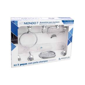 O Kit Mondo 7 peças é composto por: 1 cabide, 1 porta toalha de rosto, 1 saboneteira parede, 1 saboneteira de bancada, 1 porta toalha de banho, 1 porta papel higiênico e 1 porta shampoo (acompanha buchas e parafusos).