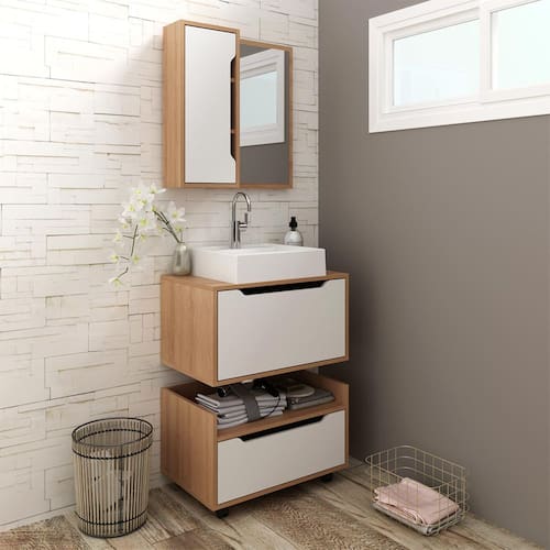 Kit de Banheiro Modulado Gabinete Pia e Espelheira Amêndoa Branco