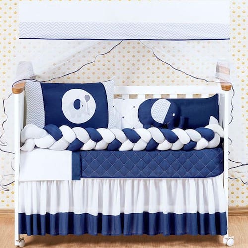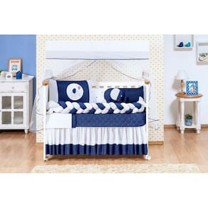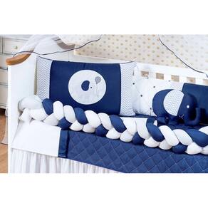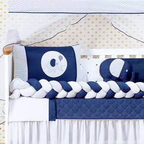 Kit de berço elefante trança azul marinhoConteúdo e medidas:1 edredom: 1,25m x 75cm 1 bandô de mosqueteiro: 1.40mx20cm1 mosquiteiro: 4,60m x 1,50m1 cabeceira: 60m x 40cm1 lateral: 1.25x0.25mts1 trança: 1.25x0.12 mts 1 lençol: 1,25m x 95cm ------ 100% algodão1 fronha: 30cm x 20cm ------ 100% algodão1 trocador: 50cm x 40cm1 almofada elefante 0,30cm x 0,35cm1 saia box : 1,30m x 0,70m x 0,30mDescrição das peças :tecido estampado 100% algodão Tecido liso 100% poliéster Jogo de lençol tecido 100% algodão Enchimento 100% poliésterMosqueteiro 100% poliamidaInformações importantes:O produto já vai pronto para o uso, com o enchimento já incluso.Acompanha as peças conforme a descrição, não esta incluso o berçoA cabeceira e as laterais do kit possuem zíper para retirar o enchimento, facilitando assim uma possível lavagem do produto. Marca: L2m