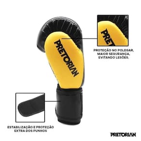 Composição:- PU (Poliuretano);- Espuma moldada de alta densidade;- Fechamento de alta intensidade ajustável ao pulso. Indicações de uso:- Para pratica de Boxe e Muay Thai;- Para uma pratica segura tenha sempre o acompanhamento de um profissional. - Marca: Pretorian - Faixa Etária: Adulto