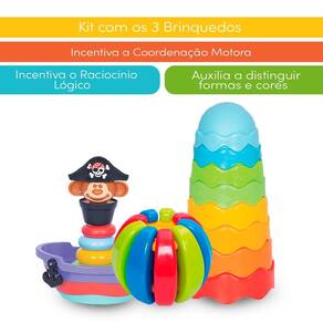 Kit de Brinquedos para Bebês Acima de 6 Meses Menino e Menina Kit de Brinquedos para Bebês Acima de 6 Meses Menino e Menina Apresentamos nosso Kit de Brinquedos Educativos: Baby Pirata, Torre Didática e Bola em Gomos Estimule o aprendizado e a imaginação das crianças com esses incríveis brinquedos, são brinquedos seguros e de alta qualidade, feitos para durar e proporcionar momentos inesquecíveis. KIT COM 3 BRINQUEDOS: 1 Baby Pirata 1 Torre Didática 1 Bola em Gomos BENEFÍCIOS - Incentiva a Coordenação Motora - Incentiva o Raciocínio Lógico - Auxilia a Distingui Formas e Cores MEDIDAS: - Pirata: 22 x 18cm - Torre: 30 x 16cm - Bola: 16 x 16cm IDADE RECOMENDADA: - Pirata: 5 meses - Torre: 5 meses - Bola: 5 meses : de 30 dias pelo fabricante Aprovado pelo INMETRO PALAVRAS-CHAVE: Brinquedos Educativos, Brinquedos 6 meses, Brinquedos acima de 6 meses, Brinquedos Infantil, Brinquedos Menino e Menina Homologação Inmetro: CE-BRI/IDEAL 00150/22-03