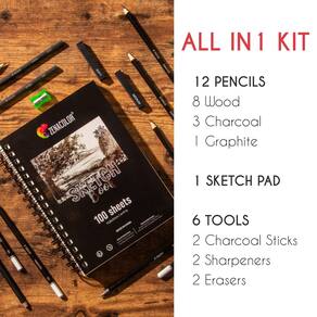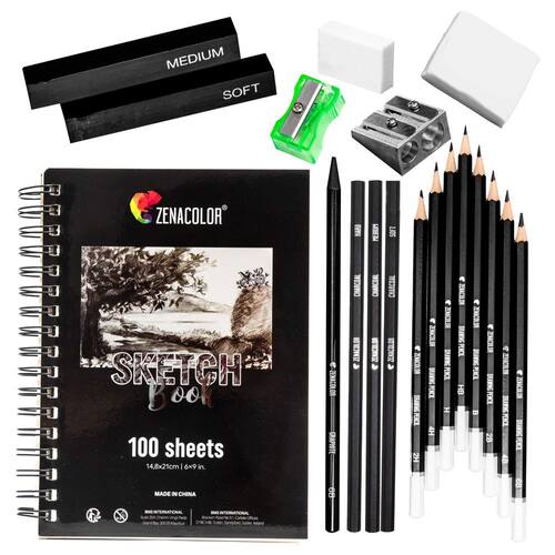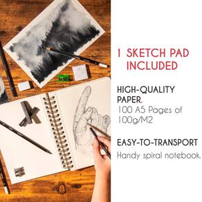 Zenacolor Kit completo de caderno de desenho com caderno de esboços A5 e lápis – 8 lápis de desenho, 3 lápis de carvão, 1 lápis de grafite, 2 bastões de carvão, bloco de esboço de 100 páginas para - Kit de suprimentos de arte – kits completos incluindo 1 caderno de esboços, 8 lápis de madeira, 1 lápis de grafite e 3 lápis de carvão, 2 bastões de carvão, 2 apontadores de lápis, 1 clássico e 1 borracha amassada - Bloco de esboço – Estes cadernos de desenho Zenacolor têm 100 páginas A5 feitas com papel de 100 g/m² - para todas as suas criações. As folhas grandes são resistentes a rasgos e descoloração e podem ser usadas para misturar pastéis de óleo ou lápis de cor. - Variedade de lápis – Cada lápis de arte tem um grau diferente: 4H, 2H, HB, B, 2B, 4B, 6B, para fornecer a você um kit de ferramentas para desenhar, esboçar e escrever - Combinação de materiais de desenho – Além dos ustensils clássicos, este kit de arte com estojo de ferramentas de esboço também tem todos os materiais técnicos - Garantia de 100% de satisfação – Nossa empresa está comprometida em ajudar você a se divertir, e é por isso que todos os nossos produtos têm uma garantia de 100% de satisfação. Se você não estiver satisfeito com seu conjunto de lápis de desenho dentro de 30 dias após sua compra, você pode pedir um reembolso