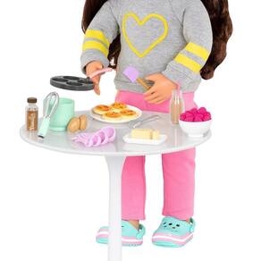 Para começar o dia com guloseimas deliciosas Comece a manhã da sua boneca de 46cm com o conjunto de café da manhã Our Generation Este acessório é perfeito para brincar de cozinhar e tem detalhes realistas que tornam a preparação do café da manhã muito divertida Misture os ovos, o bloco de manteiga, o leite e o extrato de baunilha com o batedor e a espátula; certifique-se de adicionar a quantidade certa com as colheres medidoras Use a panela para cozinhar as panquecas e, em seguida, vire-as no prato quando terminarem de cozinhar. Adicione coberturas das tigelas de frutas de framboesa, mirtilo e banana fatiada e, em seguida, cubra com uma calda deliciosa - hmmmm Toda boneca merece começar o dia com um grande café da manhã Boneca vendida separadamente. Our Generation não se trata apenas de uma boneca, um lindo conjunto de roupas ou mesmo um kit de acessórios fantásticos. É sobre incentivar crianças de todos os estilos e gostos a criar suas próprias histórias, desenvolvendo um universo ilimitado de brincadeiras com bonecas e acessórios. Sua embalagem é feita de material reciclado, especialmente desenvolvida para uma geração mais ecológica que não aceitaria nada menos. Essa é a nossa história, e essa é a nossa turma