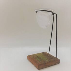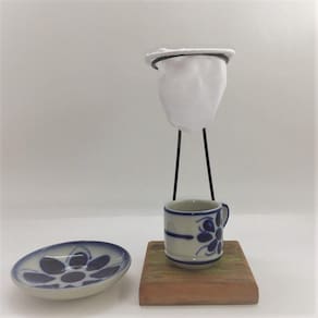 Esse kit é composto pela base madeira de demolição, coador de pano, 1 Xicara e 1 pires.