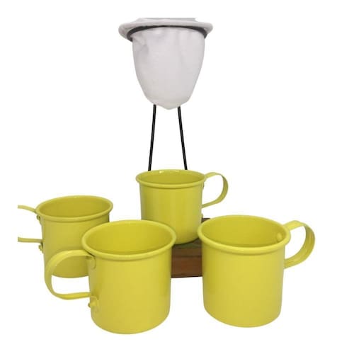 Kit de Café Individual- 4 canecas Amarela - coador Demolição Você que gosta de café coado e quer beber quando tiver vontade.Esse kit é composto pela base madeira de demolição, coador de pano, 4 quatro canequinhas Amarelas.Produto artesanal, podem ter varições nos tons.CanequinhaAltura - 5,8cm Diâmetro - 6cmCoador:Base madeira de demolição: 10cm x 10cm x 2cmAltura total: 22cmDiâmetro base coador 8,5cm