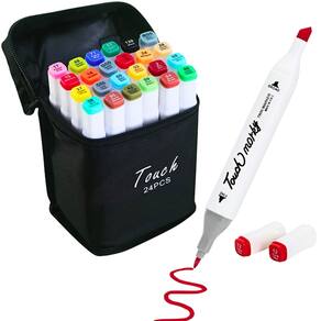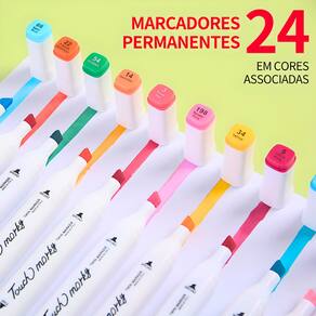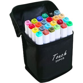 Este kit de canetas ponta dupla oferece 24 cores vibrantes, perfeitas para artistas e entusiastas do desenho. Com tampas codificadas por cores e design ergonômico, facilita a organização e uso prolongado. As pontas finas e largas oferecem versatilidade, permitindo linhas precisas ou traços mais largos. A tinta à base de água é rápida, não tóxica e segura. Vem com um estojo de transporte preto, ideal para presentes e para quem ama criar em diversas técnicas artísticas.