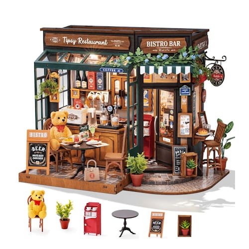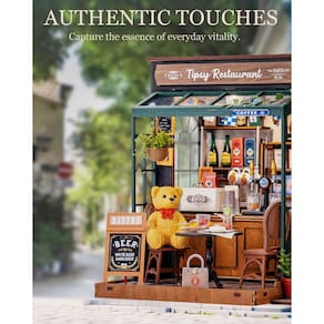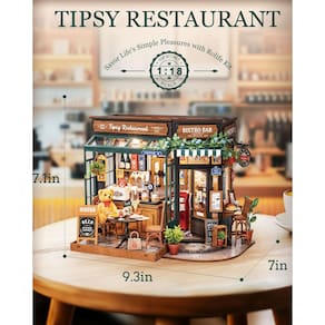 Rolife Tipsy Restaurant é um kit de modelos de casa em miniatura em escala 1:18. A mini casa permite que você crie uma encantadora cena de café que captura a essência da alegria e vitalidade. Com LED e detalhes requintados, será uma delícia na sehlf e um bom ajuste para seus adoráveis mini bonecos. Especificações: Nome: Tipsy Restaurant Peças: 297 peças Tempo estimado: 5h Tamanho montado: 23,5 x 17,8 x 18 cm Material: madeira, plástico, papel. Versão: A versão clássica Observação: 1. O kit de montagem precisa ser montado sozinho. Os acessórios necessários estão incluídos com um manual em inglês claro. 2. Se você tiver algum problema durante a montagem, como peças ausentes ou quebradas, forneceremos substituição incondicional. - ?Ambiente pitoresco?Traga o charme de um café aconchegante para sua casa com nosso requintado kit de casa em miniatura. Da fachada convidativa ao canto de jantar fofo, ele captura o sabor do relaxamento embriagado em sua vida diária, tornando-o um projeto encantador para amantes de bricolage e mentes criativas. - Detalhes encantadores: o kit em miniatura inclui acessórios realistas e cenas que fazem você se sentir como se estivesse em um café de verdade: prateleira cheia de copos e garrafas, bandeiras coloridas, mesa de jantar, etc. A luz LED adiciona um ambiente aconchegante ao seu mundo em miniatura. Basta preparar 2 pilhas AAA com antecedência (não incluídas). - ?Amigável para iniciantes?Não são necessárias habilidades especiais ou ferramentas para montar este kit de mini casa de bonecas. Tudo o que você precisa é embalado em uma caixa. De móveis reduzidos a plantas pequenas, instruções detalhadas facilitam a montagem. Basta abrir a caixa e liberar seu arquiteto interior! - ?Artesanato desestressante?Permita-se fazer uma pausa do desconforto da vida cotidiana com este mini kit de construção de casas. Quando você se concentra no projeto, todas as suas preocupações simplesmente desaparecem. E é aí que as pessoas chegam facilmente a um estado de fluxo. Lembre-se de compartilhar a alegria de criar seu mundo em miniatura! - ?Presente impressionante?Surpreenda um amigo, membro da família ou outro amante de livros com este mini diorama exclusivo da casa. Seja exibido em uma prateleira como um booknook ou utilizado como um hobby para aliviar o desconforto, nosso kit de casa de bonecas em miniatura certamente encantará.