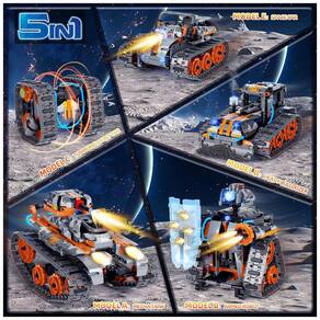 Kit de construção de carro, robô, tanque, escavadeira, rastreador 5 em 1 Os brinquedos de haste podem ser construídos em 5 modelos de estilos diferentes. O Modelo A é um tanque com bastante potência, forte poder de fogo e controle remoto livremente. O Modelo B é um robô de batalha com características autênticas. O Modelo C é um carro acrobático que gira e gira em 360. O Modelo D é um trator de construção pesada realista. O Modelo E é um carro de corrida todo o terreno com um senso de tecnologia do futuro. As crianças podem desfrutar de 5 experiências diferentes de construir e brincar.