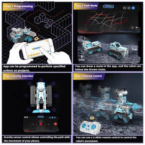 Controle APP: O robô pode ser controlado através de um aplicativo móvel e controle remoto, proporcionando um modo de controle duplo para o máximo prazer. O recurso de programação a vapor permite que você programe movimentos e ações específicos para o robô, criando seus esquemas de controle exclusivos. Esse recurso é especialmente útil para usuários avançados que desejam explorar todo o potencial dos recursos do robô.