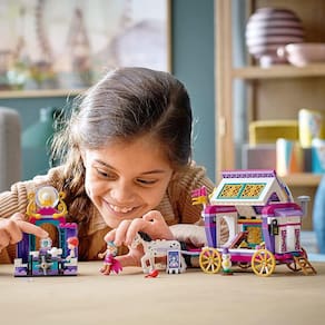 Procurando um presente para um garoto que gosta de veículos peculiares? Deliciá-los com a Caravana Mágica LEGO Friends (41688). Este playset de grande valor apresenta um brinquedo de caravana infantil, uma tenda de vidente, 2 mini-bonecas e figuras de cavalo e coruja. A caravana puxada por cavalos está repleta de características tradicionais, como persianas de rede bonitas e uma lanterna à moda antiga. O telhado é articulado para permitir que as crianças explorem os aposentos. Dentro eles vão encontrar uma cama, uma cozinha com um fogão e uma mesa que eles podem comer ao redor. Eles podem então cuidar do cavalo ou brincar com a coruja. Na tenda há uma bola de cristal. Controlado por uma função de torção, ele gira para revelar o futuro de Mia. As crianças podem escolher se ele pousa em um rosto triste ou um rosto feliz ou simplesmente deixar o destino decidir... Introduza pequenos construtores aos brinquedos de Heartlake City, onde um mundo de diversão realista de role-play aguarda. Lego Friends define ajudar as crianças a explorar suas paixões na companhia de personagens emocionantes.