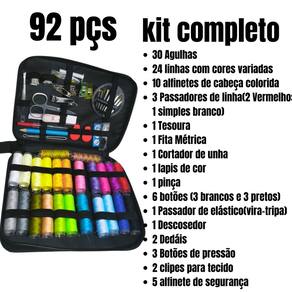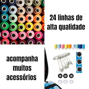 Acessórios Incluídos:30 agulhas24 linhas coloridas 10 alfinetes 3 passadores de linha(2 vermelhos e 1 branco simples)1 tesoura1 fita métrica 1 cortador de unha1 lápis de cor 1 pinça 6 botões (brancos e pretos) 1 passador de elástico 1 descosedor2 dedais 3 botões de pressão2 clipes para tecido 5 Alfinetes de Segurança