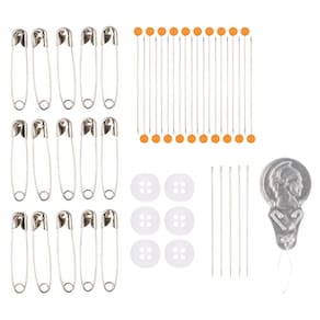 - CONJUNTO DE COSTURA ESSENCIAL: Conjunto de costura com tesouras de detalhes curvados de 10 cm com lâminas de aço inoxidável, 4 carretéis de linha de 25 metros, fita métrica de 1,5 m, 6x tiras de fita, 5x agulhas de mão, 15x pinos de segurança, 20x pinos retos, 6x botões, 2x lápis de tecido e enfiador de agulha