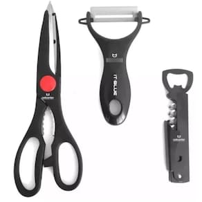 O Kit De Cozinha Saca Rolha Tesoura Descascador Abridor. Com um comprimento ideal, garantindo durabilidade e resistência. Suas tesouras de cozinha possuem corte reto e ponta especial, facilitando o uso em diversas tarefas culinárias. Adquira já o seu e tenha mais praticidade na sua cozinha.