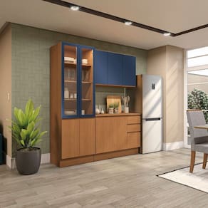 Beleza e qualidade com o kit CB1272 da Cozinha Ciela da Kappesberg. Produzido com corpo em MDP de 1,5 cm e portas em MDF de 1,8 cm , ele garante robustez e qualidade. Com cristaleira, aéreo, balcão de pia e tampo, de 120cm, ele conta com até sete camadas de pintura. A caixaria e os balcões são em pintura touch na cor canela, com a textura dos veios da madeira, enquanto as portas superiores são em azul profundo, com acabamento fosco. E para um melhor acabamento, o kit conta com rodapés, mas acompanha as ferragens para ser montado suspenso. O destaque fica para a moldura, vidro e iluminação em led na cristaleira, além do sistema de amortecimento e corrediças telescópicas, garantindo qualidade e durabilidade. Os puxadores cava embutidos, completam a beleza e o design do produto.