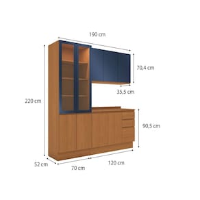Medida de cada item (A x L x P): Aéreo: 70,4 x 120 x 37,5 / Balcão: 88 x 120 x 52 / Cristaleira: 220 x 70 x 52 / Tampo: 2,5 x 120 x 52