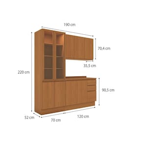 Medida de cada item (A x L x P): Aéreo: 70,4 x 120 x 37,5 / Balcão: 88 x 120 x 52 / Cristaleira: 220 x 70 x 52 / Tampo: 2,5 x 120 x 52