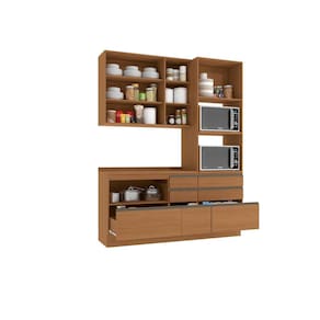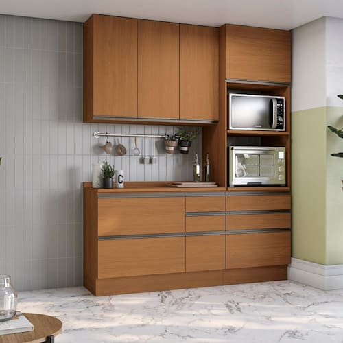 Beleza e qualidade com o Kit Cozinha Maxxi CB446 da Kappesberg. Prático e moderno, ele é produzido em MDP de 1,5 cm , para mais robustez e qualidade. Com balcão e aéreo de pia, de 120cm, kit forno e microondas e tampo, ele pode ser utilizado em todos os espaços. Compacto, o kit conta com prateleiras e gavetas, ideal para organizar louças e mantimentos. E para um acabamento perfeito, ele conta com rodapé, mas acompanha as ferragens para ser montado suspenso na parede. Com até sete camadas de pintura, seu acabamento touch na cor canela, com a textura dos veios da madeira, além de combinar com todos os ambientes, garante a sensação de conforto e aconchego ao espaço. Os destaques ficam para o sistema de amortecimento e os puxadores em alumínio na cor champagne, que garantem um design único.