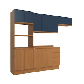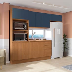 Beleza e qualidade com o Kit CB1269 da Cozinha Ciela da Kappesberg. Produzido com corpo em MDP de 1,5 cm e portas em MDF de 1,8 cm , ele garante robustez e um acabamento perfeito. Composto por 4 peças mais tampo, ele possui até sete camadas de pintura. A caixaria e os balcões são em pintura touch na cor canela, com a textura dos veios da madeira, enquanto as portas superiores são em azul profundo, com acabamento fosco, unindo conforto e modernidade. E para um melhor acabamento, ele conta com rodapés, mas acompanha as ferragens para ser montado suspenso. Com amplo espalo, o combo é ideal para organizar louças e mantimentos. O destaque fica para as dobradiças com amortecimento as corrediças telescópicas, além de puxadores cava embutidos, que completam a beleza e o design do produto.