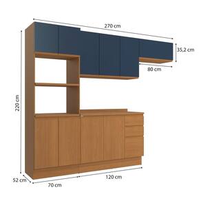 Medida de cada item (A x L x P): Aéreo: 70,4 x 120 x 37,5 / Aéreo: 35,2 x 80 x 37,5 / Balcão: 88 x 120 x 52 / Kit Forno: 220 x 70 x 52 / Tampo: 2,5 x 120 x 52