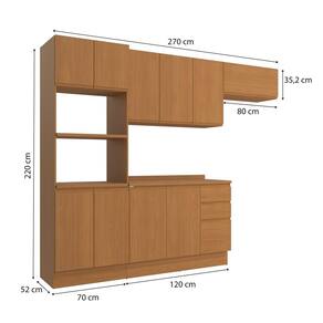 Medida de cada item (A x L x P): Aéreo: 70,4 x 120 x 37,5 / Aéreo: 35,2 x 80 x 37,5 / Balcão: 88 x 120 x 52 / Kit Forno: 220 x 70 x 52 / Tampo: 2,5 x 120 x 52