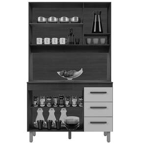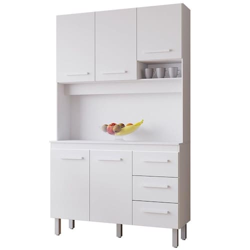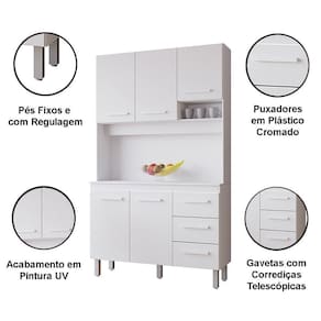 Características do Kit de Cozinha com Nicho para Microondas 5 Portas: - Estrutura em mdp; - Acabamento em pintura UV; - 5 portas com dobradiças metálicas; - 3 gavetas com corrediças telescópicas; - Puxadores em plástico cromado; - Pés com regulagem; - Altura do pé 16 cm; - Não acompanha objetos de decoração e aparelhos eletrônicos;