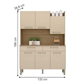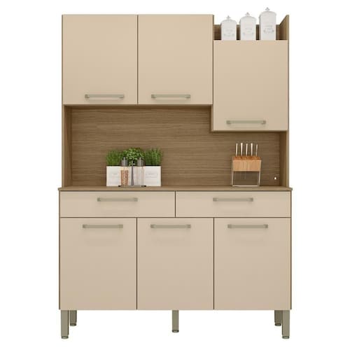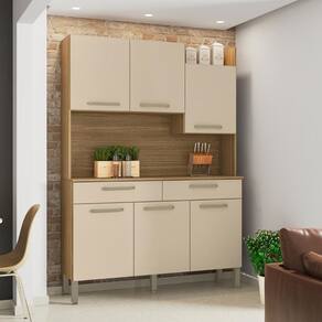 O Kit Cozinha irá se tornar o charme de sua cozinha, seu design diferenciado dispõe de um nicho para decoração superior podendo ser utilizado para vasos, flores e outros. Tem a sua disposição de um grande espaço para Eltrodomésticos podendo acomodar um micro-ondas, sua matéria prima valoriza o meio ambiente sendo feita de madeira de reflorestamento.