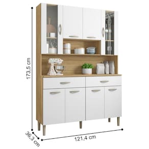 Produzido em MDP de 12mm e 15 mm, com oito portas - sendo duas portas superiores com vidro, dobradiças e corrediças 100% metálicas, duas amplas gavetas, puxadores ergonômicos em plástico resistente (poliestireno), pés fixo em plástico resistente (polipropileno).