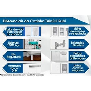 Todas as informações divulgadas são de responsabilidade exclusiva do fabricante/fornecedor. Tipo de Estrutura do Móvel: 100% aço | Quantidade de Portas: 6 Portas de Abrir | Quantidade de Gavetas: 1 | Quantidade de Prateleiras: 2 Prateleiras | Certificação de Qualidade de Móveis: Qualidade Aprovada | Garantia: 3 meses | Tipo de Pintura: Eletrostática a Pó | Características de móveis: Tampo em Fórmica de Mármore Preto | Suporte de Peso: 10 kg | Diferenciais da Gaveta: c/ Corrediças Metálicas | Tipo de Acabamento da Pintura: Semi Brilho | Tipo de puxador: Polipropileno | Garantia de Fábrica: Garantia de Fábrica | Ubicação do Móvel: Inferior | Material da Estrutura: MDP | Com rodas: Não | Quantidade de Rodas: 0 | Com gavetas: Não | Com portas: Não | É kit: Não | Requer montagem: Sim | Material dos Pés: Aço | Quantidade de Pés: 0 | Material do Tampo: MDP | Com Prateleiras Ajustáveis: Não | Com Pés Ajustáveis: Não | Com pés: Não | Material: Madeira | Material das alças: Metal | Material das portas: Vidrio | Tempo de montagem: 1 h | Acessórios incluídos: da tampa: Madeira | Material da base: Madeira | Condição do item: Novo | Produto: N/A | Cômodo Indicado: Multiuso | Quantidade de gavetas: 0 | Código universal de produto (GTIN): 7899673954207 | Condição do Item: Novo | Numeral: 0 | Não se Aplica: N/A | Não Possui: Não | Linha/Modelo: Rubi | Cor Cnova: Blush | Cor Meli: Branco | egoria Trilha: Móveis de Cozinha> Kit de Cozinha Compacta | Categoria - Sub: Kit de Cozinha Compacta | Categoria - Pai: Móveis de Cozinha | Comprimento Embalagem: 0.16 | Largura Embalagem: 1.00 | Altura Embalagem: 1.00 | Kit: 0 | Peso: 36.65 Kg | Peso Real Kg: 36.65 | Peso Cubado: 39.75 | Volumes: 3 | M3: 0.16 | Comprimento/Profundidade: 43 cm | Largura: 105 cm | Altura: 176 cm | Tamanho Montado: Larg:105.00 x Comp/Prof:43.00 x Alt: 176.00 | Comprimento/Profundidade Montado: 43.00 | Largura Montado: 105.00 | Altura Montado: 176.00 | Cor Fabricante: Branco/Preto | Data Cadastro: 2023-8-18 20:35:50 | Sigla Estoque: 6 | Marca: Telasul