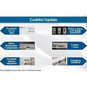 Tipo de puxador - ABS/PVC Quantidade de Portas - 11 Portas de Abrir Quantidade de Portas c/ Vidro - 4 Portas c/ Vidro Tipo de Vidro - Vidro Temperado Quantidade de Prateleiras - 5 Prateleiras