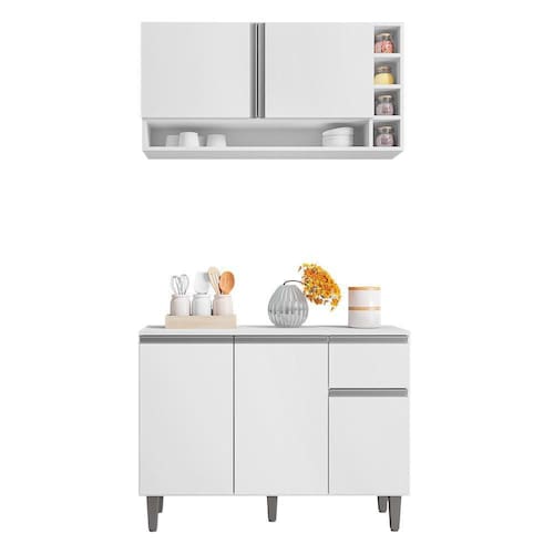O Kit de Cozinha Vanessa Balcão com Tampo e Aéreo é a solução que você procura. Escolher os móveis para a cozinha é uma tarefa desafiadora, pois envolve considerações como espaço disponível, modelo, cor e qualidade, entre outros detalhes importantes. Para facilitar sua escolha, apresentamos produtos desenvolvidos especialmente para cozinhas compactas, mantendo sempre a organização em mente. Visando praticidade e funcionalidade, o Balcão de Cozinha possui um tampo para expor utensílios e eletrodomésticos, 3 portas, 1 prateleira, pés em PVC e 1 gaveta com corrediças telescópicas, proporcionando armazenamento eficiente para talheres, panelas e mantimentos. O Armário Suspenso acompanha 2 portas, 1 prateleira e 1 nicho com 4 compartimentos para armazenar temperos, potes, pratos e outros itens essenciais. Ambos os móveis são fabricados com 100% de MDP, acabamento em pintura UV, puxadores embutidos e dobradiças metálicas, assegurando resistência e durabilidade.