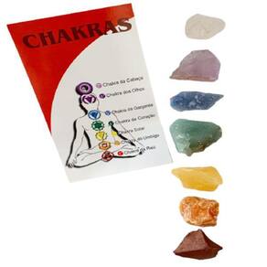 Kit de Cristais Bruto - 7 Chakras, contém 7 pedras naturais brutas com aproximadamente 2 a 3cm, acompanha card explicativo sobre as propriedades terapêuticas e energéticas das pedras.