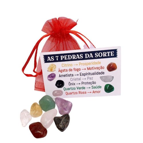 Kit de Cristais 7 Pedras da Sorte, contém 7 pedras naturais roladas com aproximadamente de 1 a 2cm, acompanha card explicativo sobre as propriedades terapêuticas e energéticas das pedras e saquinho de organza para guardá-las.