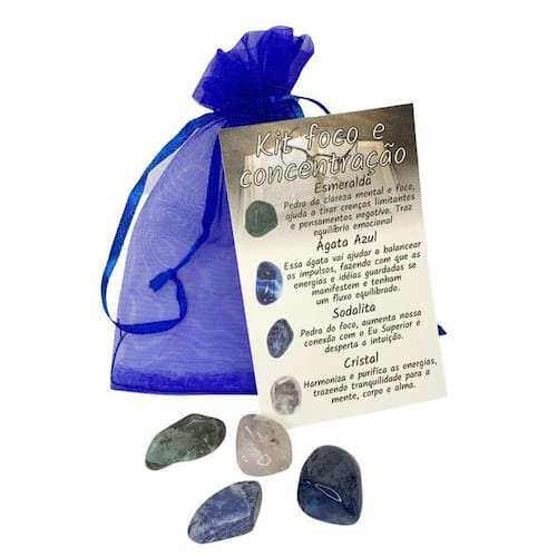 Kit de Cristais Foco e Concentração, contém 4 pedras naturais roladas com aproximadamente de 1 a 2cm, acompanha card explicativo sobre as propriedades terapêuticas e energéticas das pedras e saquinho de organza para guardá-las.Esmeralda: pedra da clareza mental e foco, ajuda a tirar crenças limitantes e pensamentos negativo. Traz equilíbrio emocional.Ágata Azul: ajuda a balancear os impulsos, fazendo om que as energias e idéias guardadas se manifestem e tenham um fluxo equilibrado.Sodalita: pedra do foco, aumenta nossa conexão com o Eu Superior e desperta a intuição.Cristal: harmoniza e purifica as energias, trazendo tranquilidade para a mente, corpo e alma.Por se tratar de pedras naturais existe variação de cor, tamanho e formato. Marca: Cristais Naturais
