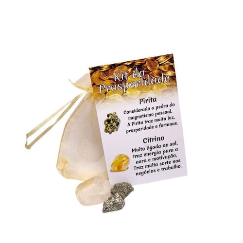 Kit de Cristais da Prosperidade, contém 1 pedra natural rolada e uma pedra natural bruta com aproximadamente de 1 a 2cm, acompanha card explicativo sobre as propriedades terapêuticas e energéticas das pedras e saquinho de organza para guardá-las.
