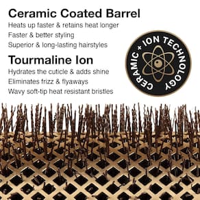 Olivia Garden is the leader in producing professional salon brushes. Each brush is carefully crafted the deliver the best results for any styling need. This is a professional brush that every station needs or you can take with you wherever you go. Features: Unique Bristle Design: Special wavy heat resistant bristles, Soft-tip - gentle on hair Great for volume, waves or curls. Unlimited styling flexibility. New Turbo Barrel: Extra large vents. Greater airflow. Reduces drying time Tourmaline Ion Technology: Hydrates the cuticle. Adds more shine to the hair. Eliminates frizz and flyaways. Hair is healthier and easier to style Latest Ceramic Technology: Heats up faster and retains heat longer Superior and long-lasting hairstyles Unique Handle Design: Easy-grip ergonomic handle. Lightweight for effortless styling Retractable sectioning pick - Perfeito para criar volume, ondas ou cachos em todos os tipos de cabelo