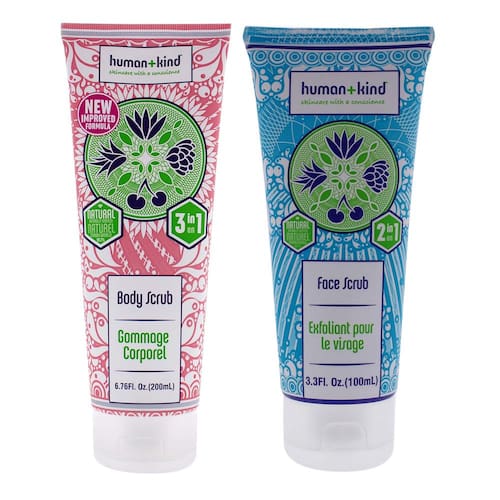 - Human+Kind; kit de esfoliação corporal e facial; esfoliante corporal de 6,76 onças, esfoliante facial de 3,3 onças