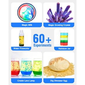 - Mais de 60 experimentos: o kit científico projetado especialmente para crianças de 5 a 8 anos. O kit científico inclui mais de 60 experimentos: erupção vulcânica, escavação de ovos de dinossauro, animação de leite, lâmpada de lava e outras reações químicas incríveis! Cada experimento é fácil de conduzir e muito divertido!