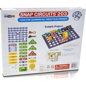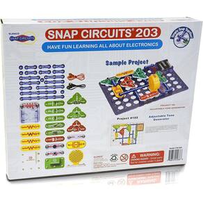 PRODUTO INTERNACIONAL. Com o kit O Snap Circuits 203, você pode aprender eletrônica enquanto se diverte com 203 projetos emocionantes! Os módulos de plástico de fácil encaixe tornam a montagem dos componentes uma brincadeira de criança.